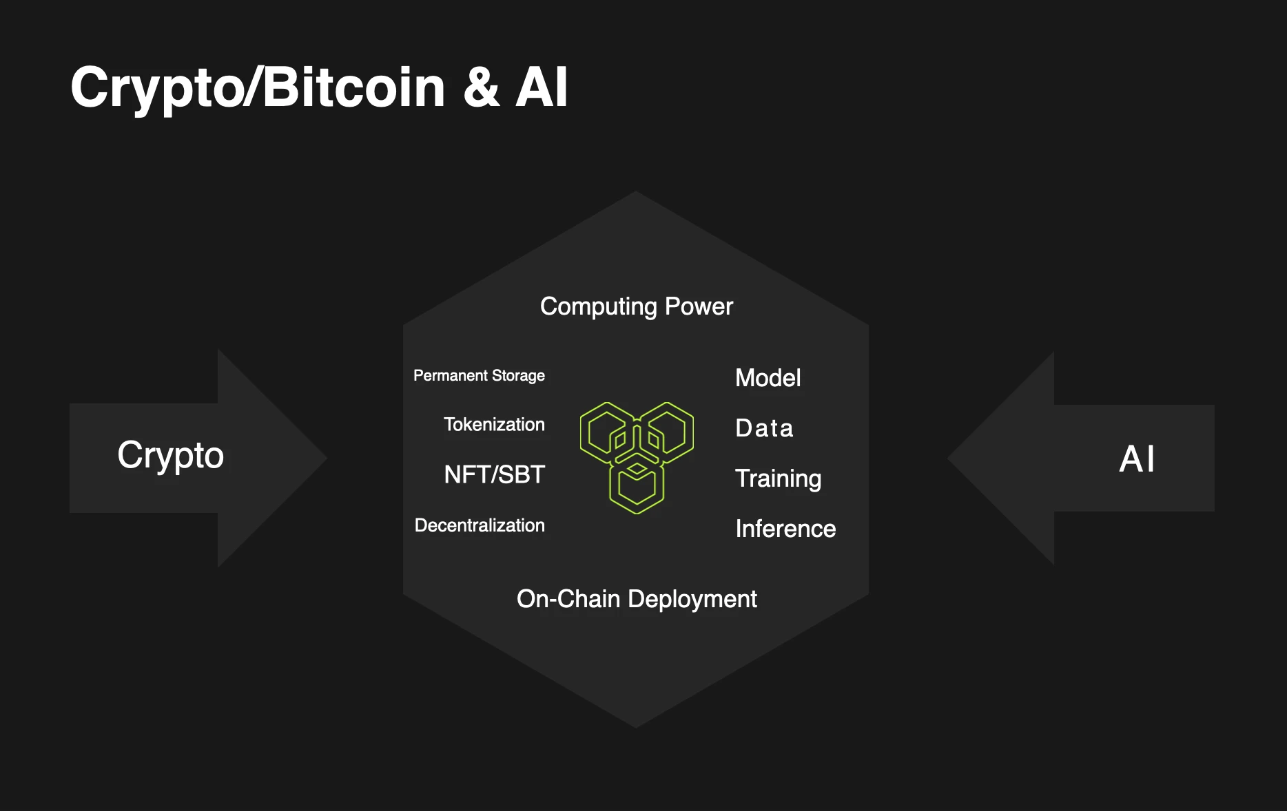 除了比特币本身相关的动态, AI 与 Crypto 的结合 也是最近行业内关注的重点,目前,我们看到从技术面发展上分析可能有以下几个结合点: