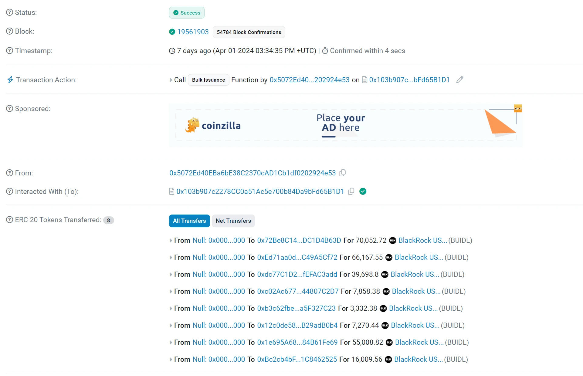 根据区块浏览器的交易记录显示, 4 月 1 日,代币化基金 BUIDL 已向 8 位投资者进行首次股息支付,其中 Ondo 地址0x 7 2B…… 6 3D收到超 7 万枚 BUIDL 代币。