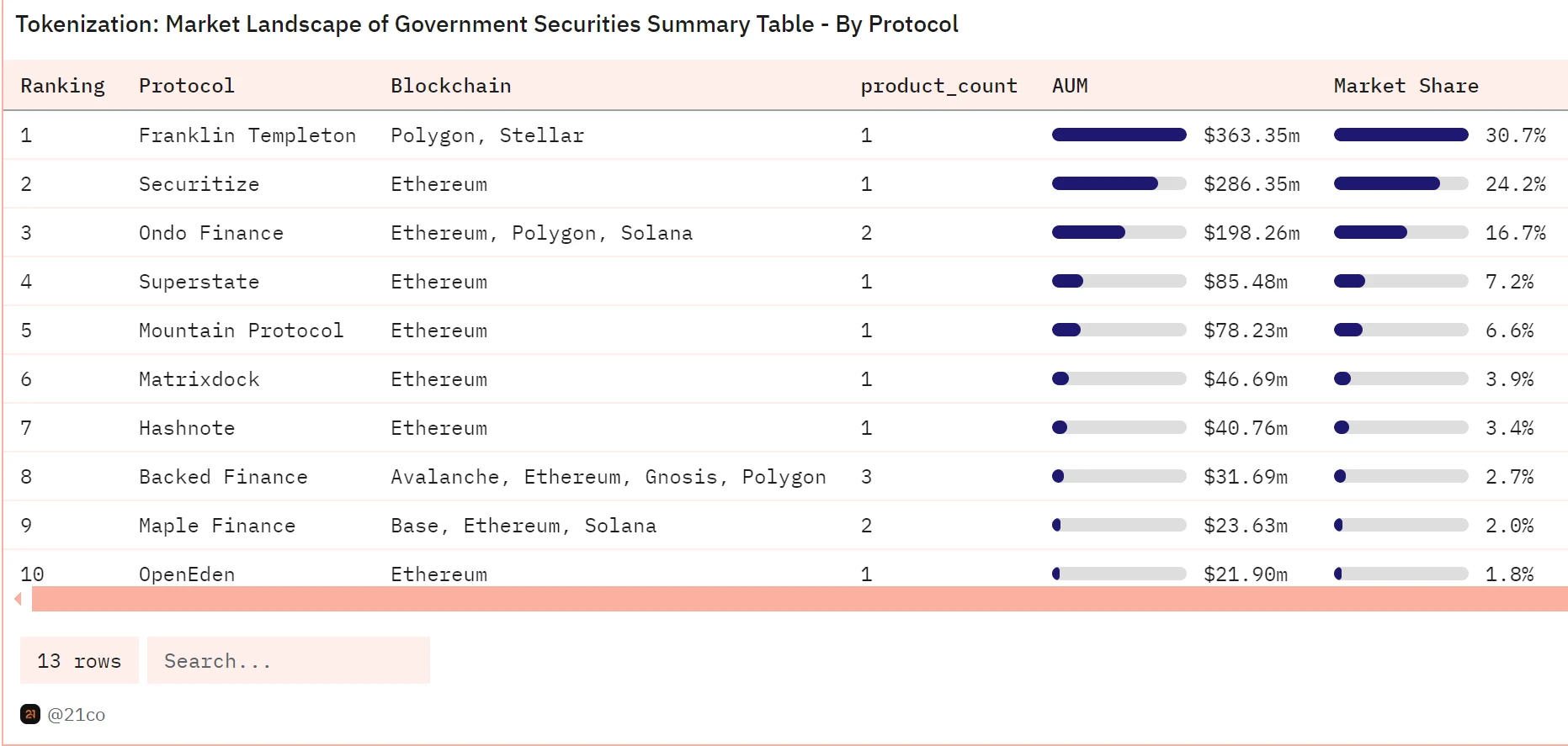 通过上图可以看到,Ondo Finance 在代币化美债市场也持有 1.98 亿美元,市场份额排名第三。值得一提的是,在贝莱德推出代币化基金 BUIDL 不到一周,Ondo Finance 宣布对其投资超 9500 万美元,占比超 33% 的 BUIDL 基金份额,也是目前 BUIDL 基金中最大的持有者。