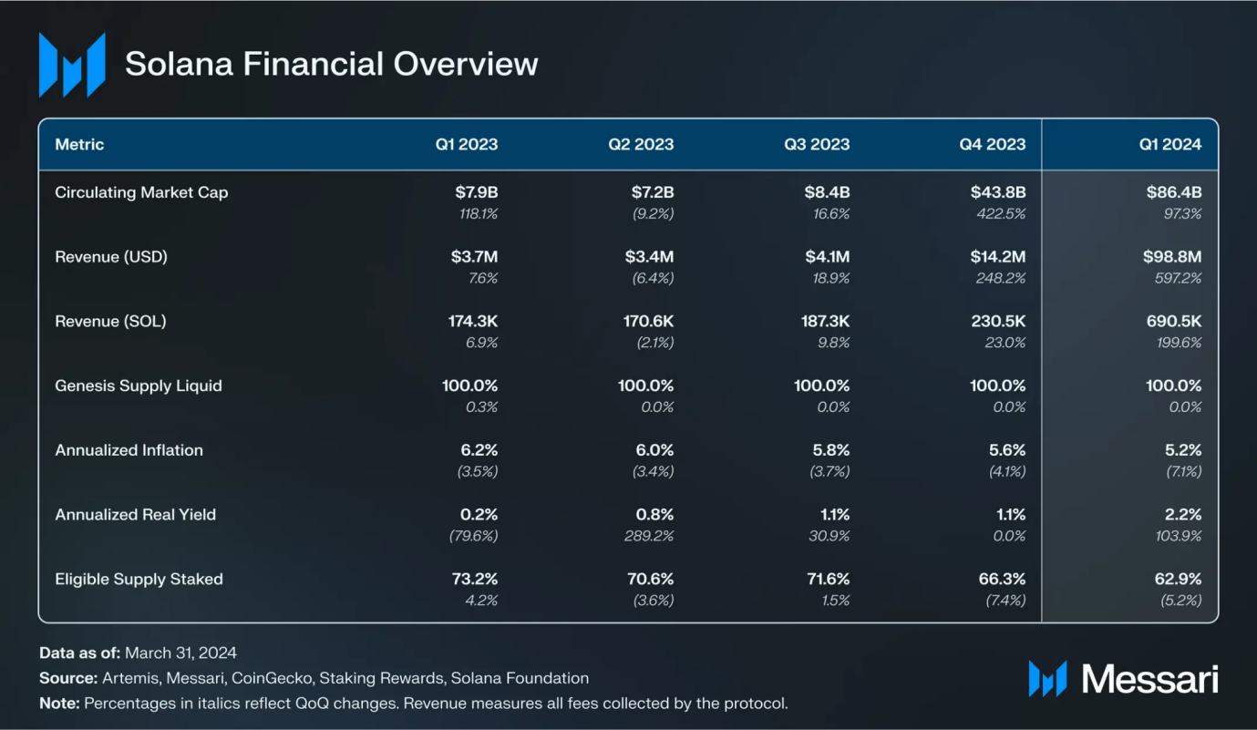 SOL 市值继续处于市场的领先地位。其市值在所有代币中排名第五,仅次于 BTC、ETH、USDT 和 BNB。在上一个周期达到 770 亿美元的峰值后,SOL 市值继续达到历史最高水平。截至 24 年第一季度,市值为 864 亿美元,环比增长 97% 。然而 SOL 距其近 260 美元的历史高点还有约 25% 的差距。