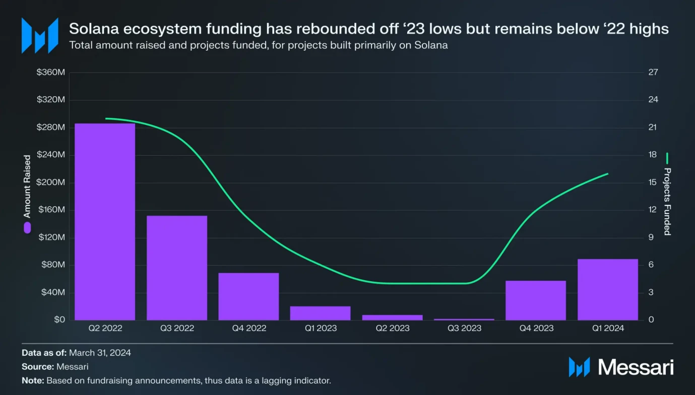 主要基于 Solana 构建的项目在第一季度融资 8920 万美元,比 2023 年全年融资总额多 250 万美元。