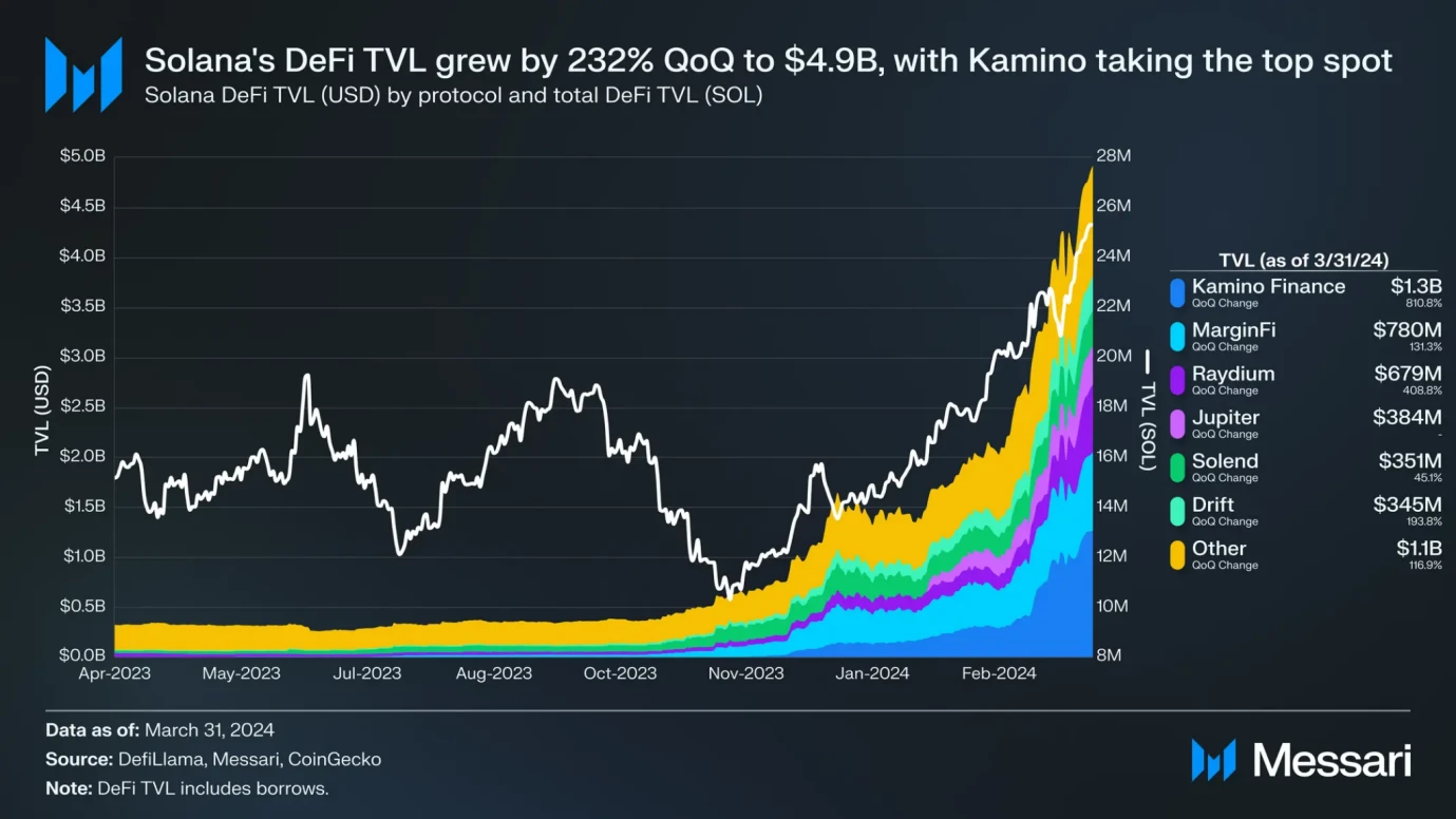 Solana DeFi TVL 环比增长 232% ,达 49 亿美元,在所有网络中排名第四。借贷和收益协议 Kamino 从 Solana 第四大协议跃升至 TVL 榜首。其借贷协议在本季度结束时获得了近 13 亿美元的 TVL,环比增长 811% 。