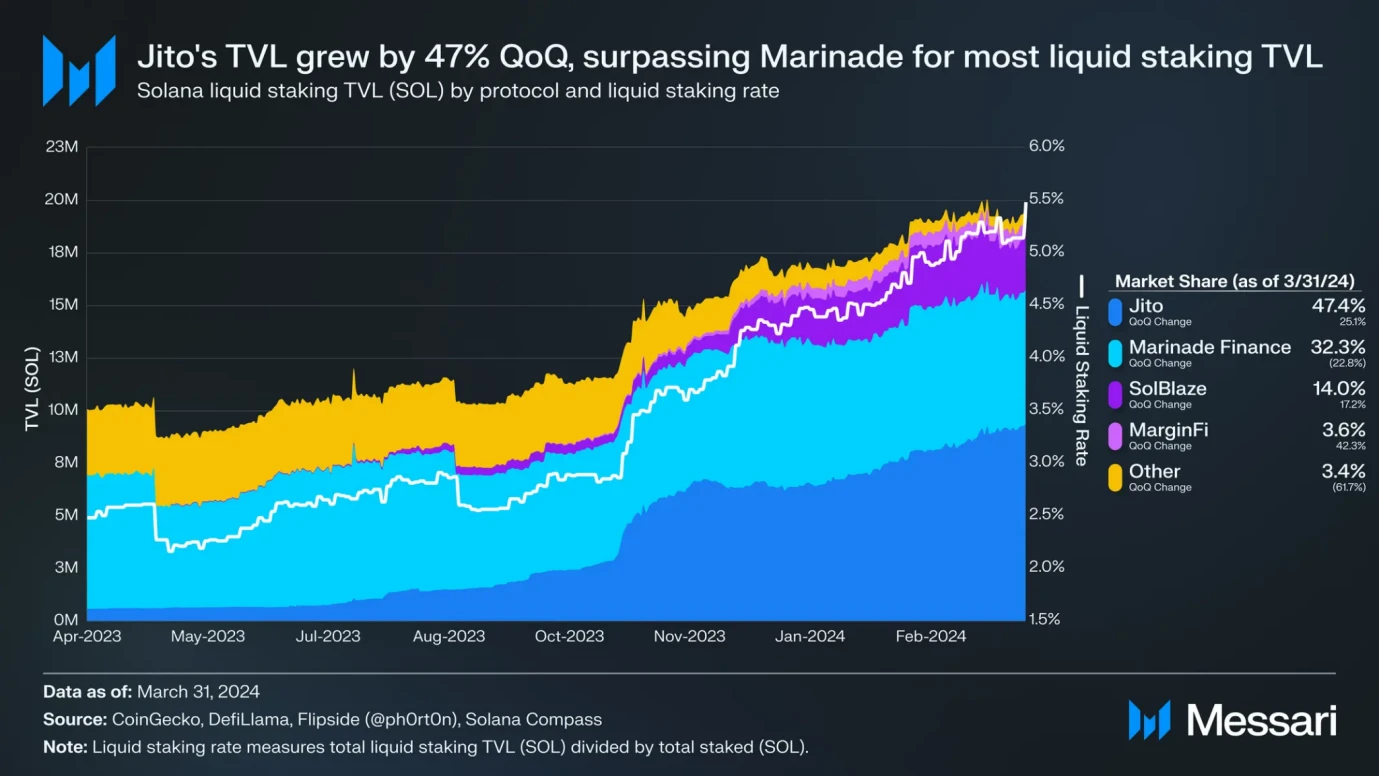 Solana 的流动性质押率环比增长 27% ,达 5.5% 。流动性质押协议 Jito 在增长方面一直处于领先地位。Jito 的 TVL 环比增长 47% 至 940 万 SOL,取代了 Marinade,TVL 排名第一。本季度末,Jito 的流动性质押市场份额接近 50% 。Marinade Liquid 的 TVL 环比下降了 9% ,降至 640 万 SOL。Blaze 的 TVL 环比增长 38% 。