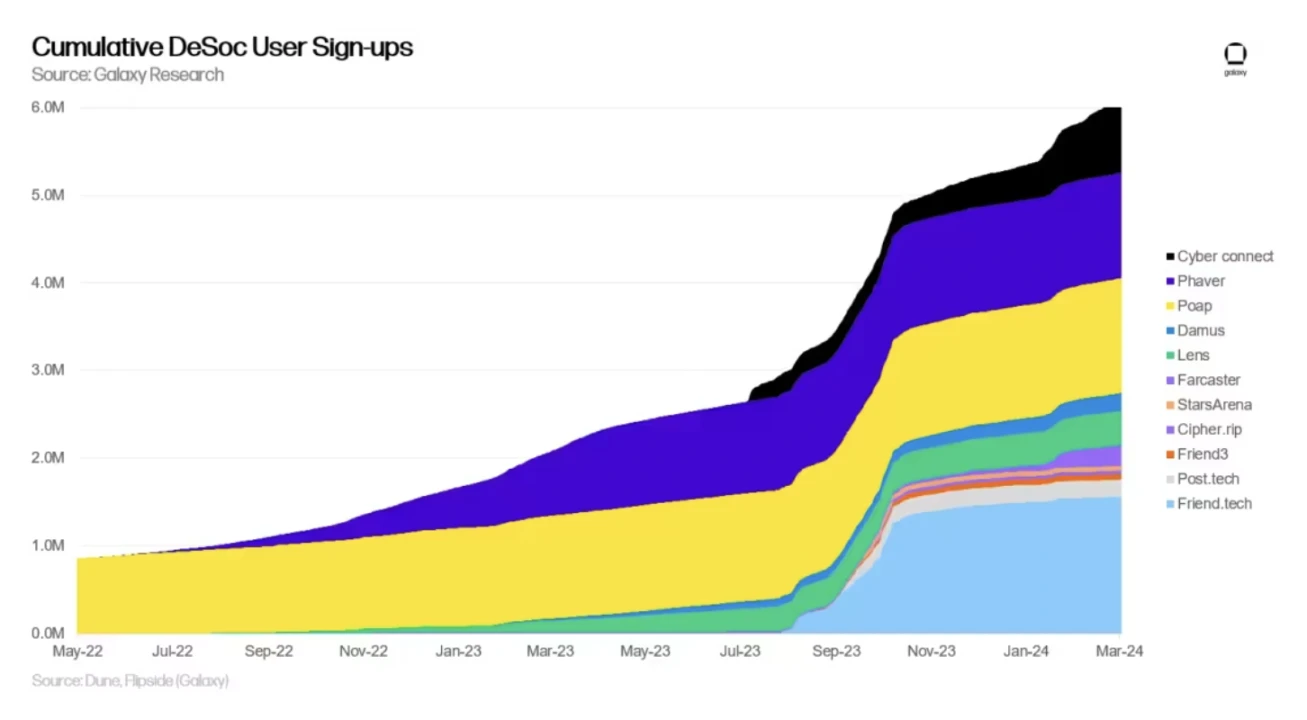 从 2023 年 9 月 1 日到 2024 年 4 月 1 日,DeSoc 的累计用户数量增加了 290 万,这在很大程度上要归功于 Friend.tech 的推出,这是一款基于 Base Rollup 的社交金融 DeSoc 应用程序。Friend.tech 从 2023 年 8 月 10 日到 2024 年 1 月 1 日增加了超过 80 万用户,为 DeSoc 的总用户数量做出了重大贡献。尽管 Friend.tech 的成功是短暂的,但这款应用显然引发了其他 DeSoc 应用的复苏。在 2023 年 10 月下旬 Friend.tech 的用户数量开始稳定后,其他 DeSoc 平台(如 Cyber Connect、Farcaster、POAP 和 Lens)的新用户出现明显的增长趋势,如下图所示: