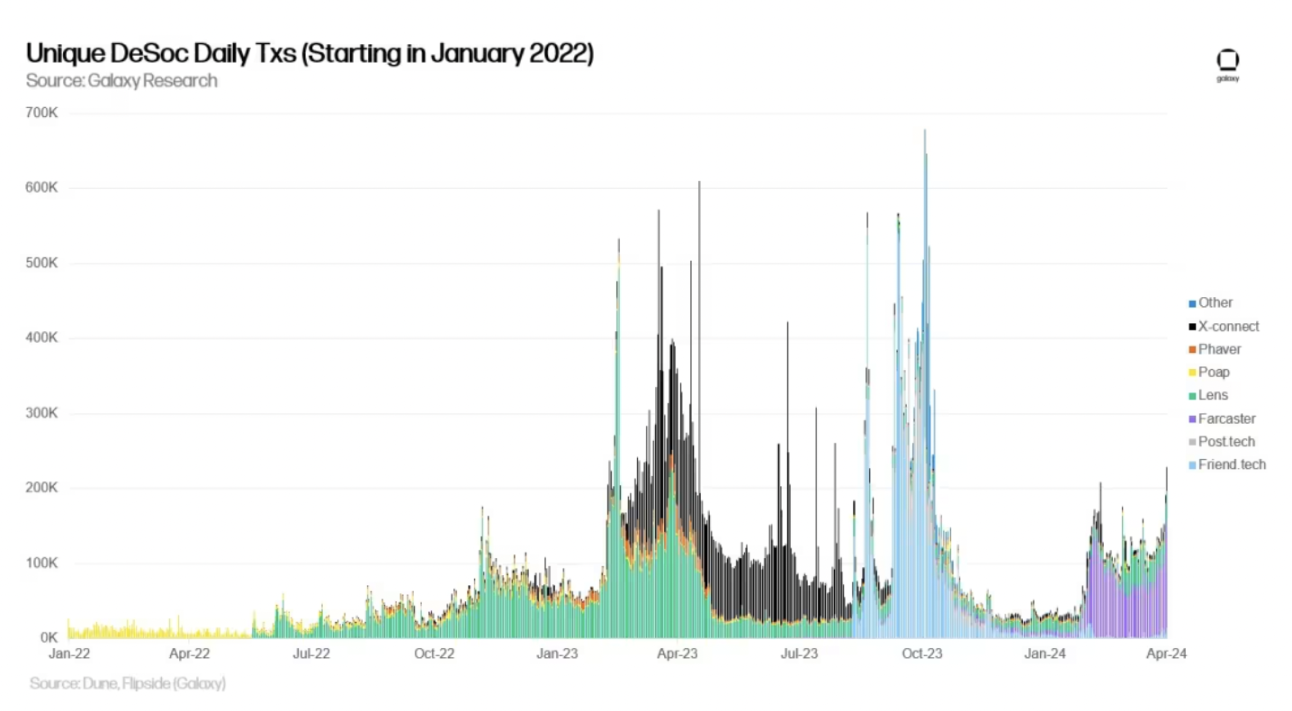 从历史上看,DeSoc 活动的激增往往遵循幂律,即一个应用程序代表所有 DeSoc 应用程序中的大多数活动。DeSoc 应用程序的这些兴衰周期凸显出 DeSoc 用户粘性弱,并且容易跳转到下一个流行的 DeSoc 应用程序。2022 年至 2024 年的最后三次活动高峰很有说服力,因为它们证明了 DeSoc 活动是由周期性叙事驱动的。