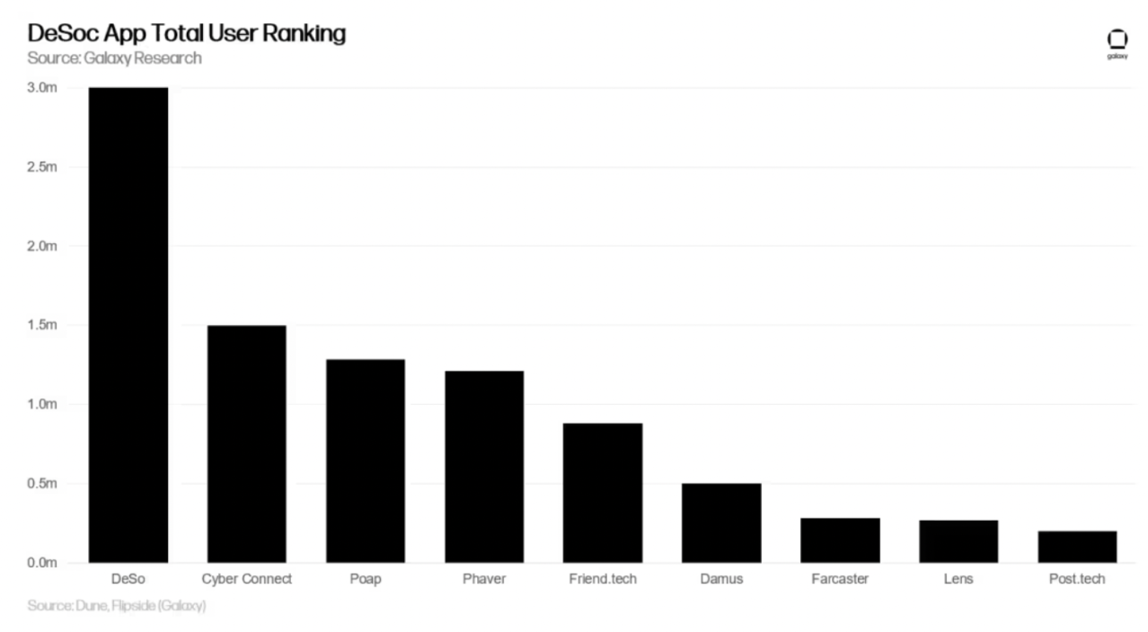 顶级 DeSoc 应用的月活跃用户约占 Twitter/X 月活跃用户群的 0.15% 。需要强调的是,累计用户数最多的两个 DeSoc 应用是在 2020 年至 2021 年之间推出的,因此它们比 Friend.tech 和 Farcaster 有更长的用户使用时间。DeSo 是 2021 年 6 月发布的 Layer 1 区块链,在 DeSoc 应用中拥有最多的用户注册量,累计用户数达 300 万。Cyber Connect 是一个去中心化的社交图谱,支持所有 EVM 兼容链,于 2021 年 9 月发布,拥有第二高的累计 DeSoc 用户注册量,自该应用诞生以来,共有 150 万用户与其互动。