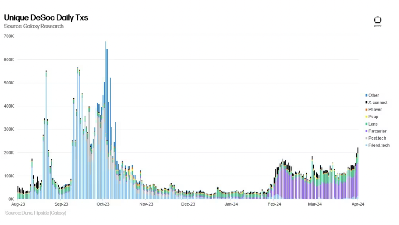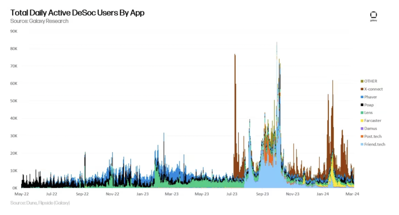 2024 年 2 月,DeSoc 活动的第三次激增是由于用户对 Farcaster 的兴趣重新兴起。Farcaster 的近期崛起代表着去中心化传统社交媒体运动的复兴,上一次复兴是在 2023 年 3 月,当时 Lens 和 X-Connect 也出现了这种现象。