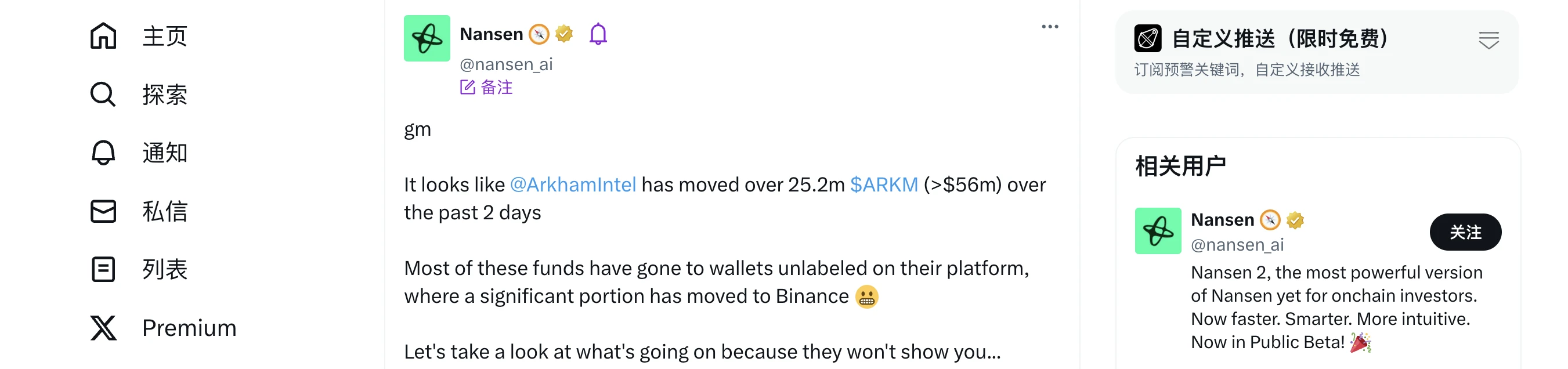 这一系列的可疑转账也受到数据分析平台 Nansen 的关注。经过详细分析,Nansen 认为 Arkham 团队存在秘密解锁部分代币转移到交易所准备出售的可能。