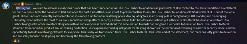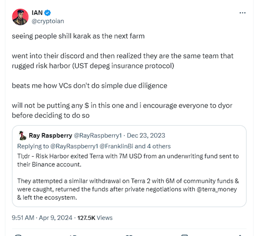 据 IAN(@cryptoian)的推特 KOL 表示,Karak 的背后团队为 Risk Harbor 的团队,Risk Harbor 曾是 Terra 生态中的资产风险保险服务商。该项目此前在 Terra 生态中 TVL 量排名第二,在 Terra 崩盘事件中损失惨重。而推特用户 @RayRaspberry1 则表示,该团队在退出 Terra 的过程中,侵吞了社区 2 亿枚 UST(价值 700 万美元)的资金。