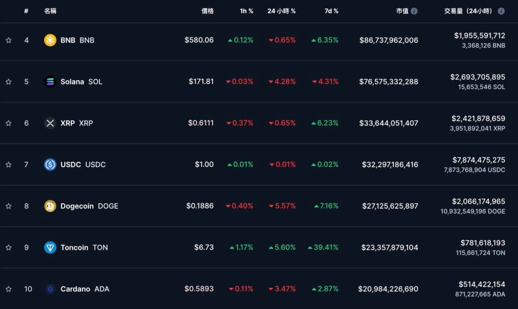 CoinMarkeCap 数据 显示 ,其他前十大币种近 24 小时多数也同步下跌,SOL 和 DOGE 下跌 4~5%,唯一逆势仍呈现上涨的则是跻身第九大代币的 TON,近 24 小时涨幅仍达 5.6%。