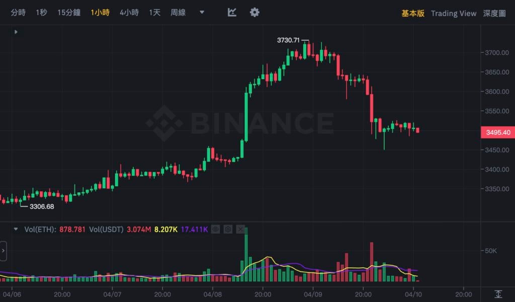 以太坊(ETH)的部分,跌幅较 BTC 更为剧烈,今(10)日稍早最低逼近 3,450 美元,截稿前现报 3,495 美元,近 24 小时下跌 5.12%。