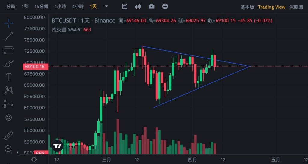 撰稿当下略有回升,现报 69,100 美元,近 24 小时下跌 3.08%。目前 BTC 走势在三角突破之后又跌回压力缐下,打破了原本的突破动能,有可能会在 6 万水平横盘更久的时间,不排除有机会再去 62,500 美元试探。