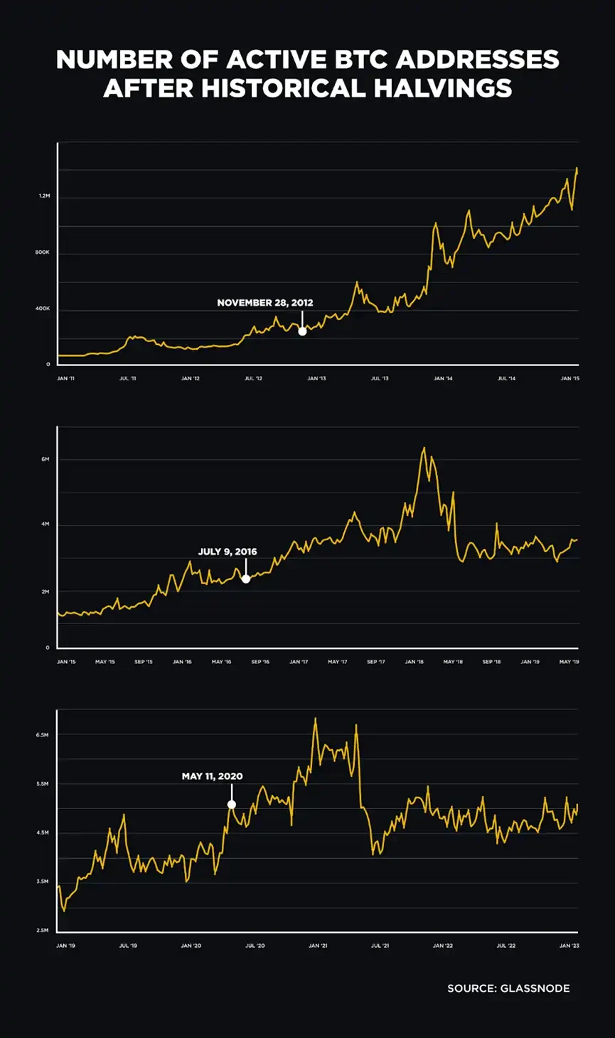 除了与价格相关的影响和更多的关注 ( 部分是通过这些影响 ) 之外,减半还与采用指标的深刻、长期增长有关。比特币在减半前和减半后的知名度提高,刺激了更多的新来者探索并可能购买数字货币,从而有助于扩大其用户群。