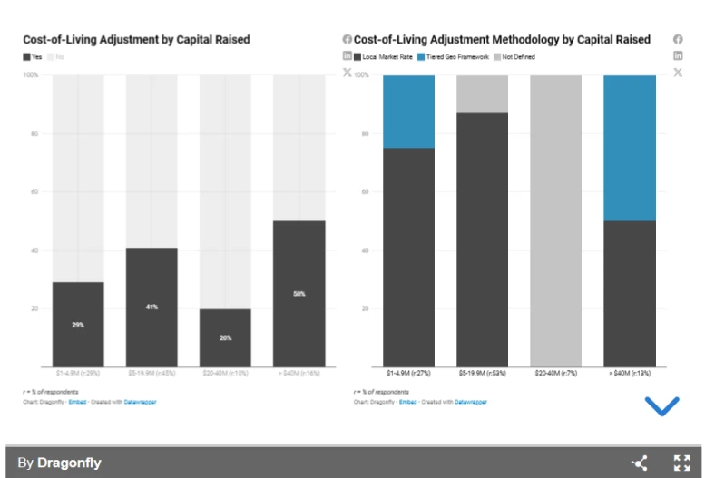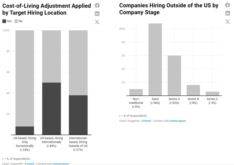 拥有 1-10 名员工的种子轮和 Pre-seed 轮公司不太可能根据生活成本进行调整,这使他们能够在招聘方面更具竞争力,因为 此时建立一个坚实的核心团队将对公司整个生命周期产生深远影响。