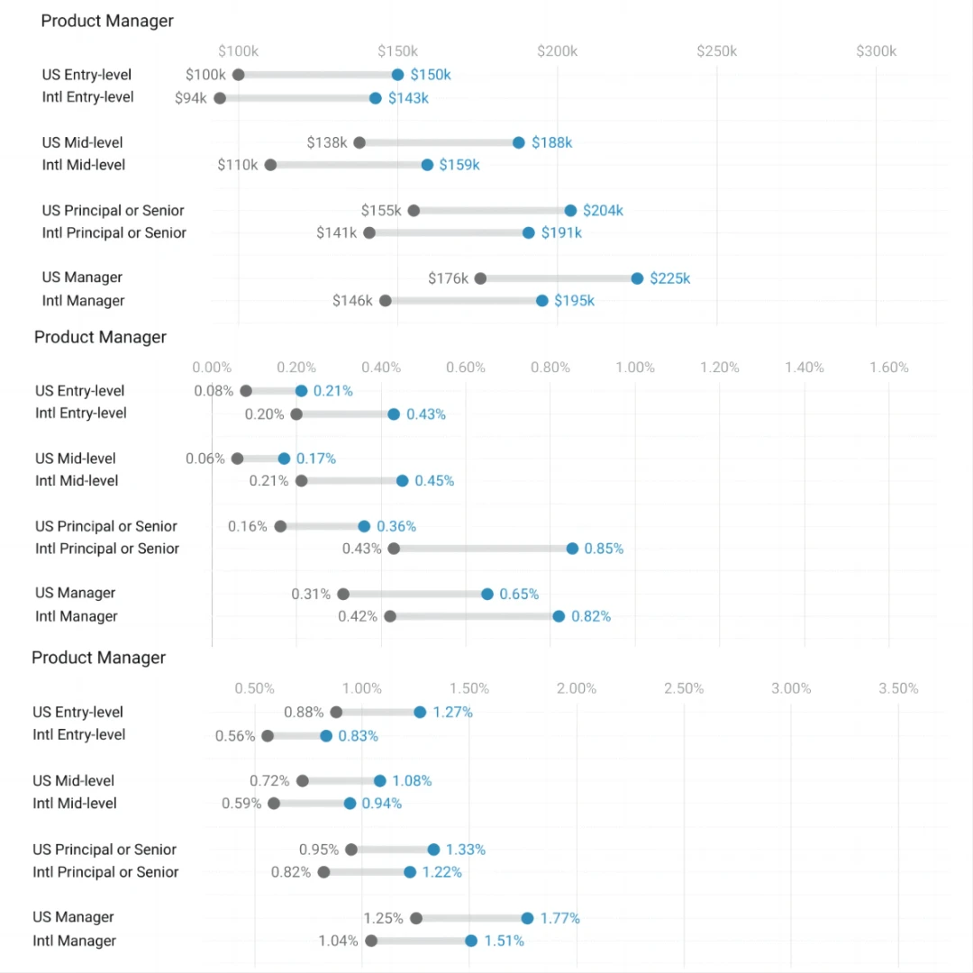 国际公司的产品经理职位在整个层级上都具有显着更高的股权补偿,这在所有职位中是独一无二的;
