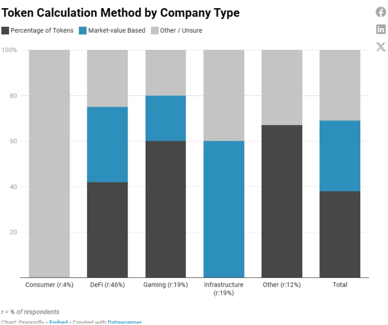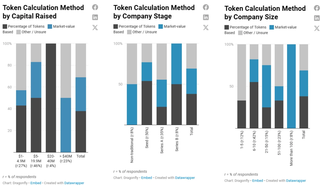 不同行业在代币计算方法上的偏好也存在差异:游戏和其他类型的公司更倾向于使用「代币比例」方法,基础设施类公司则更倾向于使用基于市场价值的方法。