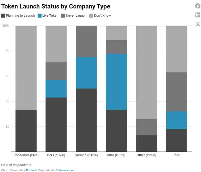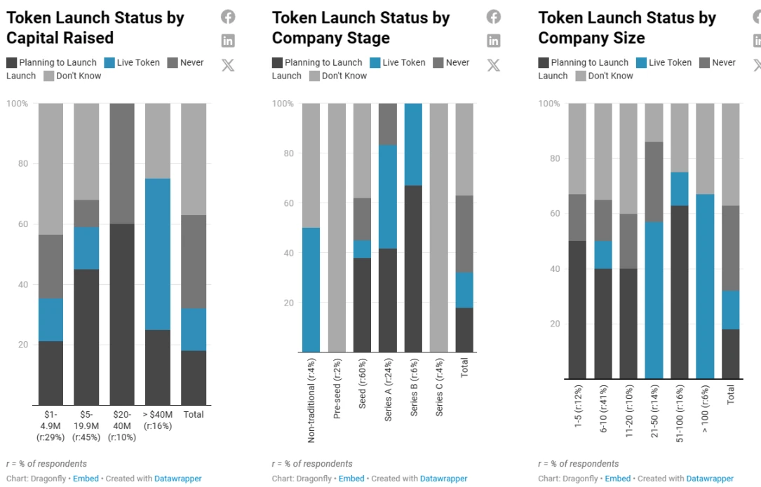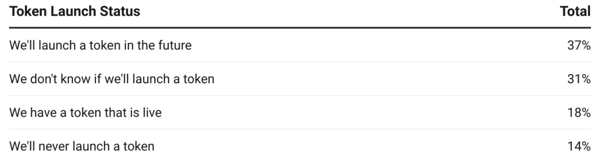 我们投资组合中的公司强烈考虑采用代币,只有 14% 的公司明确表示他们永远不会推出代币。