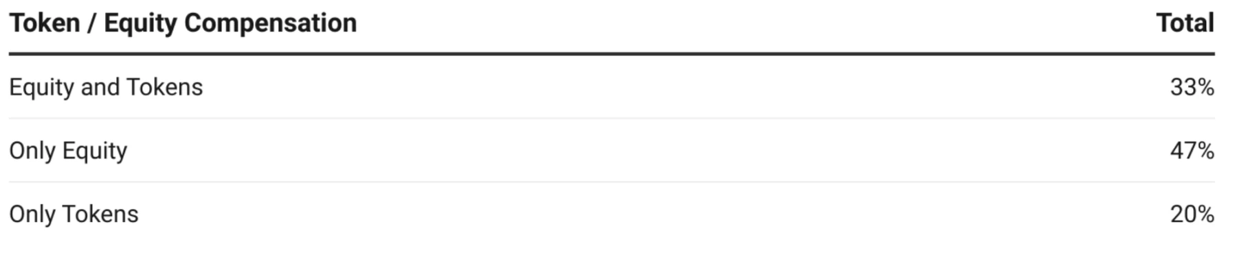 接近一半的公司只发放股权作为补偿。不过需要注意的是,大多数表示可能未来会推出代币(但还不确定)的公司目前只发放股权,而所有拥有正在使用的代币的项目都将代币作为补偿的一部分。需要考虑的是,那些不确定的公司最终可能会改变主意。