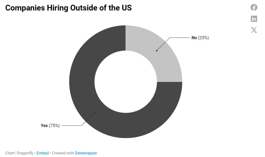 所有接受调查的公司中,无论其规模、阶段或融资情况如何,有 75% 在美国以外招聘人才。