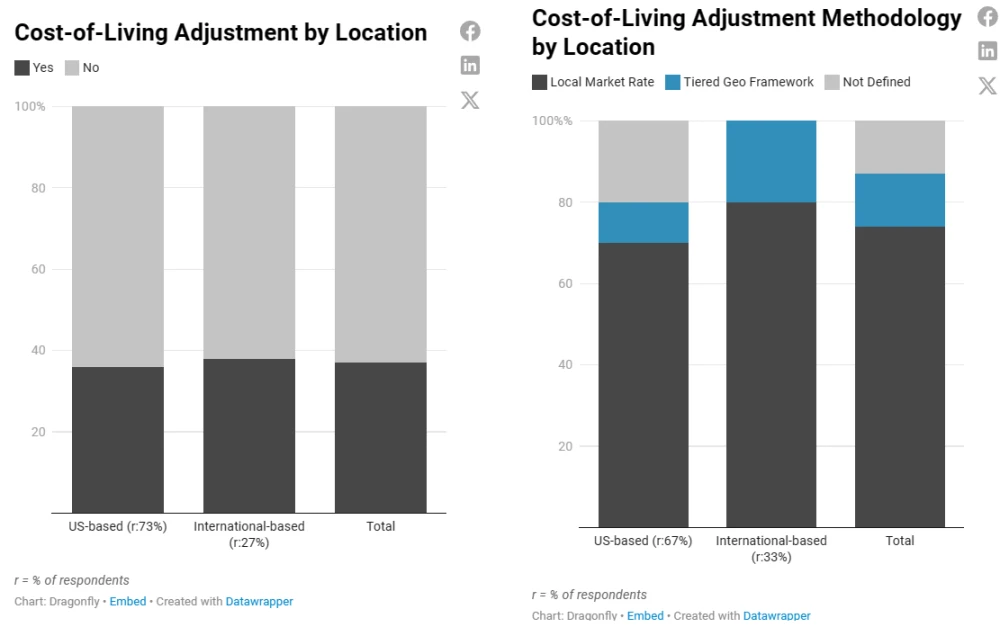 这里有一个清晰的趋势:大多数公司在早期阶段不会根据生活成本进行调整,但随着公司发展成熟,这种可能性会越来越大。