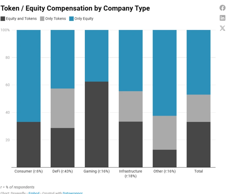 DeFi 领域(另一个代币更普遍的领域)也遵循类似的趋势,尽管补偿方式稍微更加平衡。游戏公司表现出强烈的偏好,既提供股权也提供代币, 值得注意的是,没有一家游戏公司只提供代币。