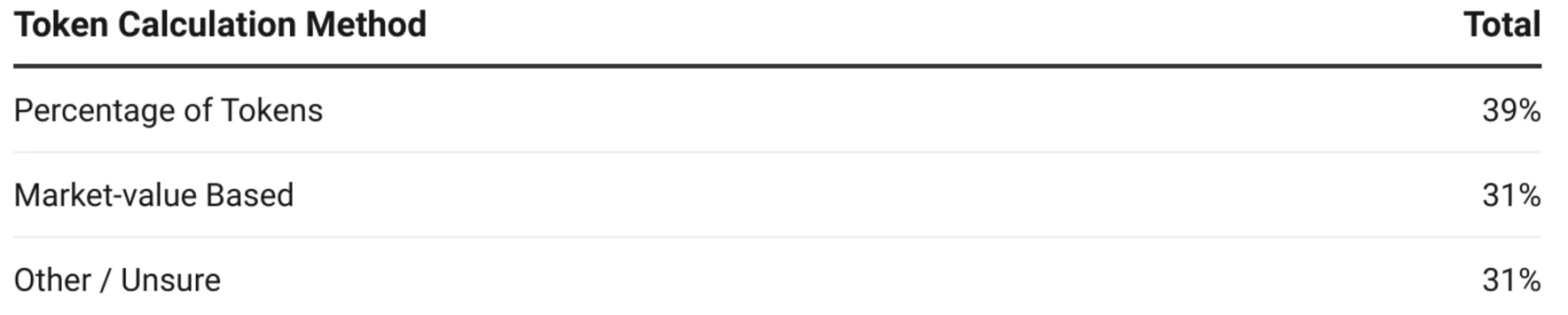 种子轮融资的公司和融资额不超过 4000 万美元的公司主要使用「代币比例」方法。基于市场价值的计算方法从 A 轮融资开始更受青睐,尤其是在拥有 21-50 名员工的公司中,而在 B 轮融资和拥有超过 100 名员工的公司中则更加普遍。值得注意的是, 融资额超过 4000 万美元的公司倾向于平衡使用基于市场价值的计算方法和其他不太明确的方法。