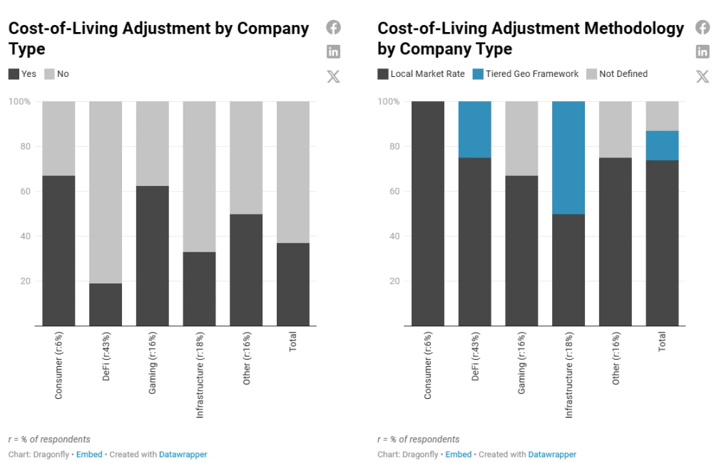 目前还没有足够多的行业数据可以轻松采用劳动力成本调整(尤其是在加密领域,例如特定城市 / 国家对协议工程师的需求)。然而,许多薪酬专家和数据提供商正在考虑这种模式,我们确实认为团队可以针对更标准化 / 通用的角色进行基准测试和调整。