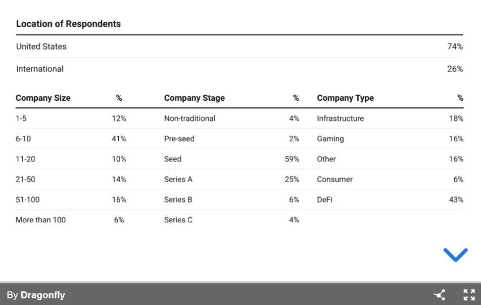 对于规模最大的公司,融资额超过 4000 万美元,员工人数超过 100 人,参与代币活动的比例明显更高。一个有趣的反例是 C 轮融资公司的犹豫不决;他们可能正在反思代币如何融入一个已经成熟的产品,或者正在考虑在新项目 / 合资企业中使用代币。