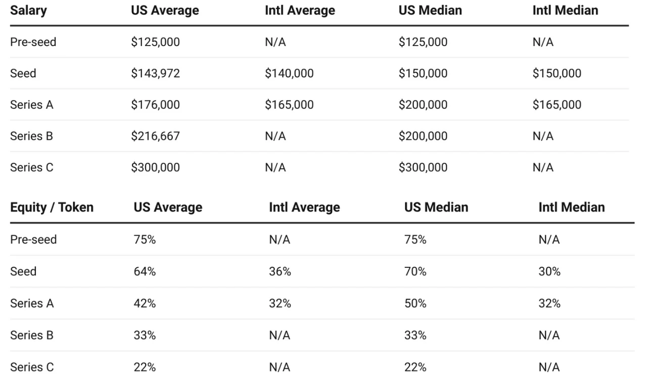 与预期一致,随着公司筹集更多资金,创始人的薪酬会增加,而股权 / 代币持股比例会下降,这可能是由于股份被稀释造成的。 大多数创始人报告称,在 B 轮融资之前他们的薪酬低于平均水平。