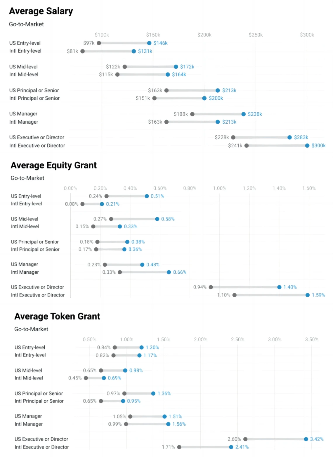 与国际公司相比,美国几乎所有职位和资历级别的薪酬都更高。平均而言,美国公司有大致 13% 的更高薪酬和约 30% 的更高股权和代币奖励计划。