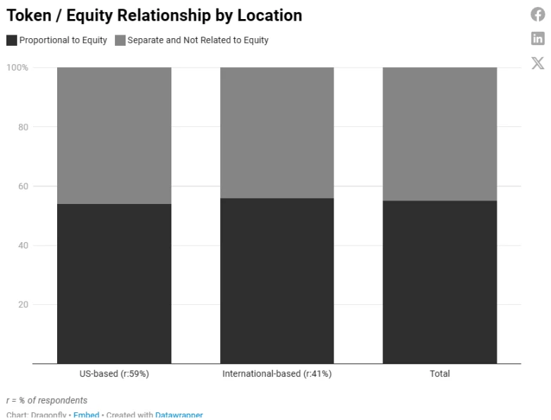 美国和国际公司在代币与股权的比例关系上呈现出平衡分布,但略微偏好比例关系。