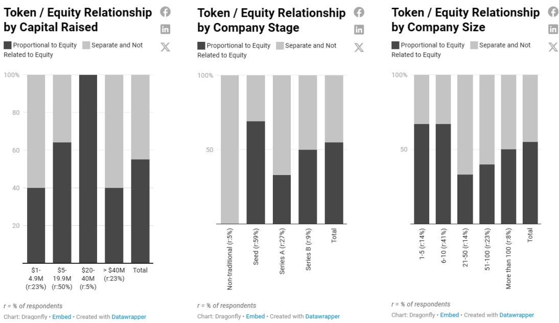 早期规模较小的团队(种子轮融资, 1-10 名员工)更倾向于股权和代币成比例分配(然而,这种趋势在所有早期融资阶段的资金水平上并不一致).