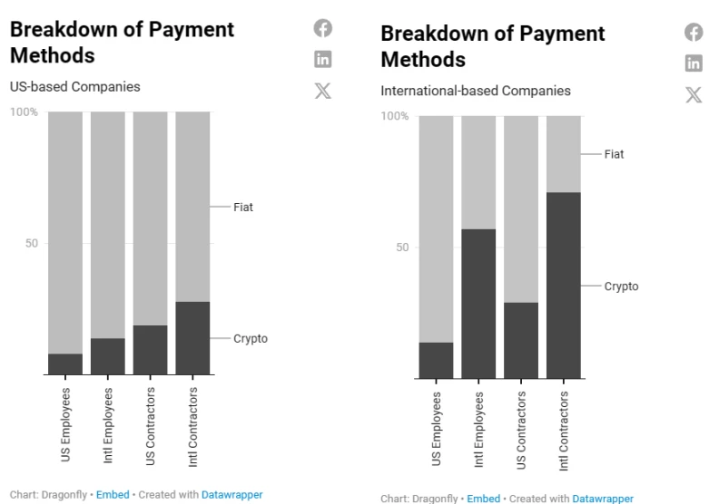 在支付加密货币(例如 USDC)方面,国际公司走在前列,尤其是在支付给国际员工方面。无论地点如何,美国公司更倾向于用加密货币支付承包商的费用,而不是员工的薪酬;他们也更倾向于用加密货币支付国际员工的费用,无论他们是员工还是承包商。