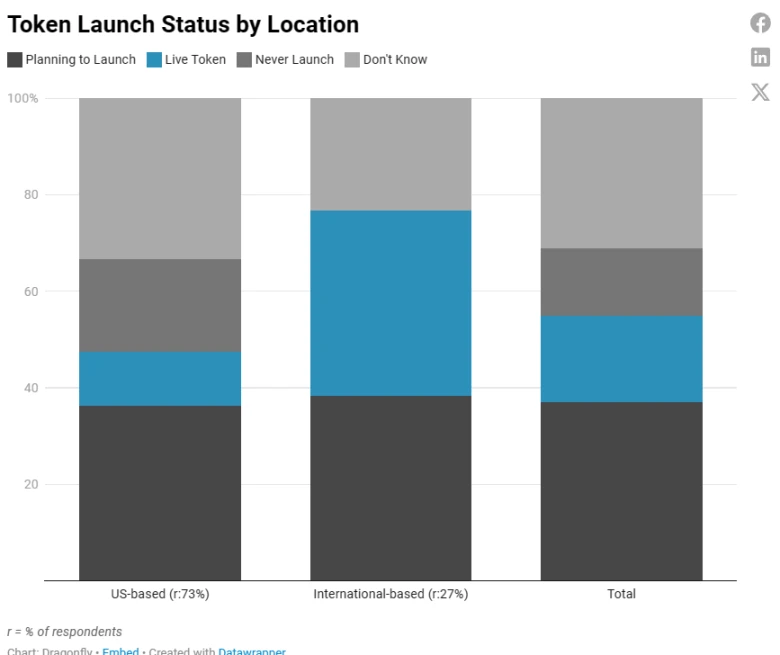 美国公司可能考虑到监管环境,反应更加多样化,拥有实际代币的公司更少,更多团队对计划犹豫不决,还有更多团队完全选择不采用代币。
