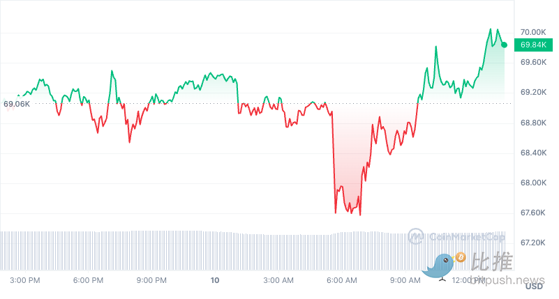 高于预期的美国消费者价格指数 (CPI) 令加密市场承压,周三早盘交易中,比特币在 6.9 万美元的支撑位附近交易,但在 CPI 发布后一度跌至 67,475 美元的低点,随后 BTC 收复 6.9 万美元失地,截至发稿时回到 69,861.99 美元,24 小时涨幅 1.03%。