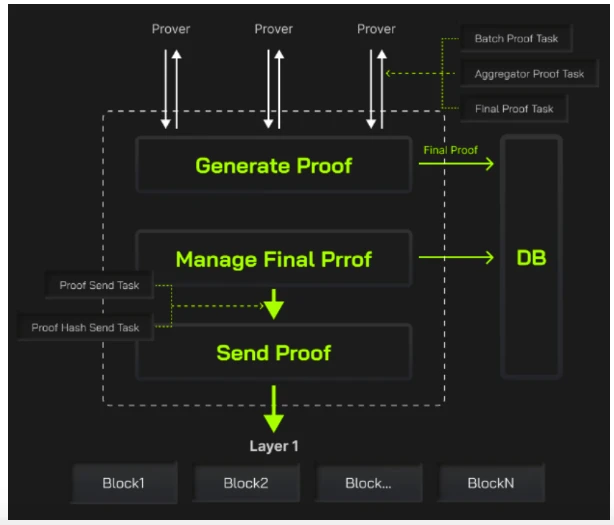 Proof Generator,负责任务分发: 将证明任务分配给 Prover(PoW 矿工),接收任务结果(矿工生成的 ZKP)并将 ZKP 存储证明在 DB 数据库中。其特点是可以并行生成,即不同的证明生成 sequences 可以同时完成(不存在上下文关系),以及同一个 sequence 内部可以同时执行多个 BatchProofTasks。