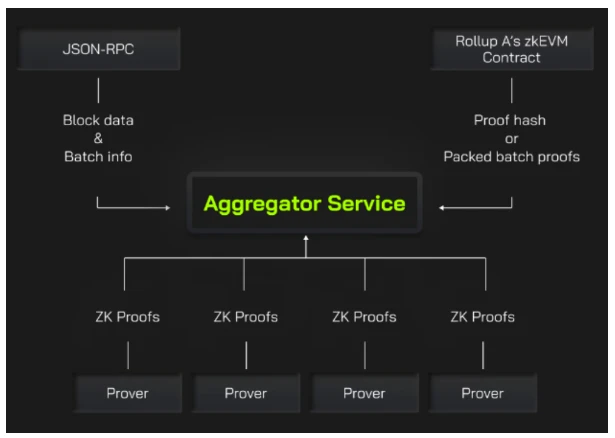 其中,Aggregator 是 Prover 的重要组成模块,它负责收发、提交和管理 ZKP 证明任务这三个子模块: