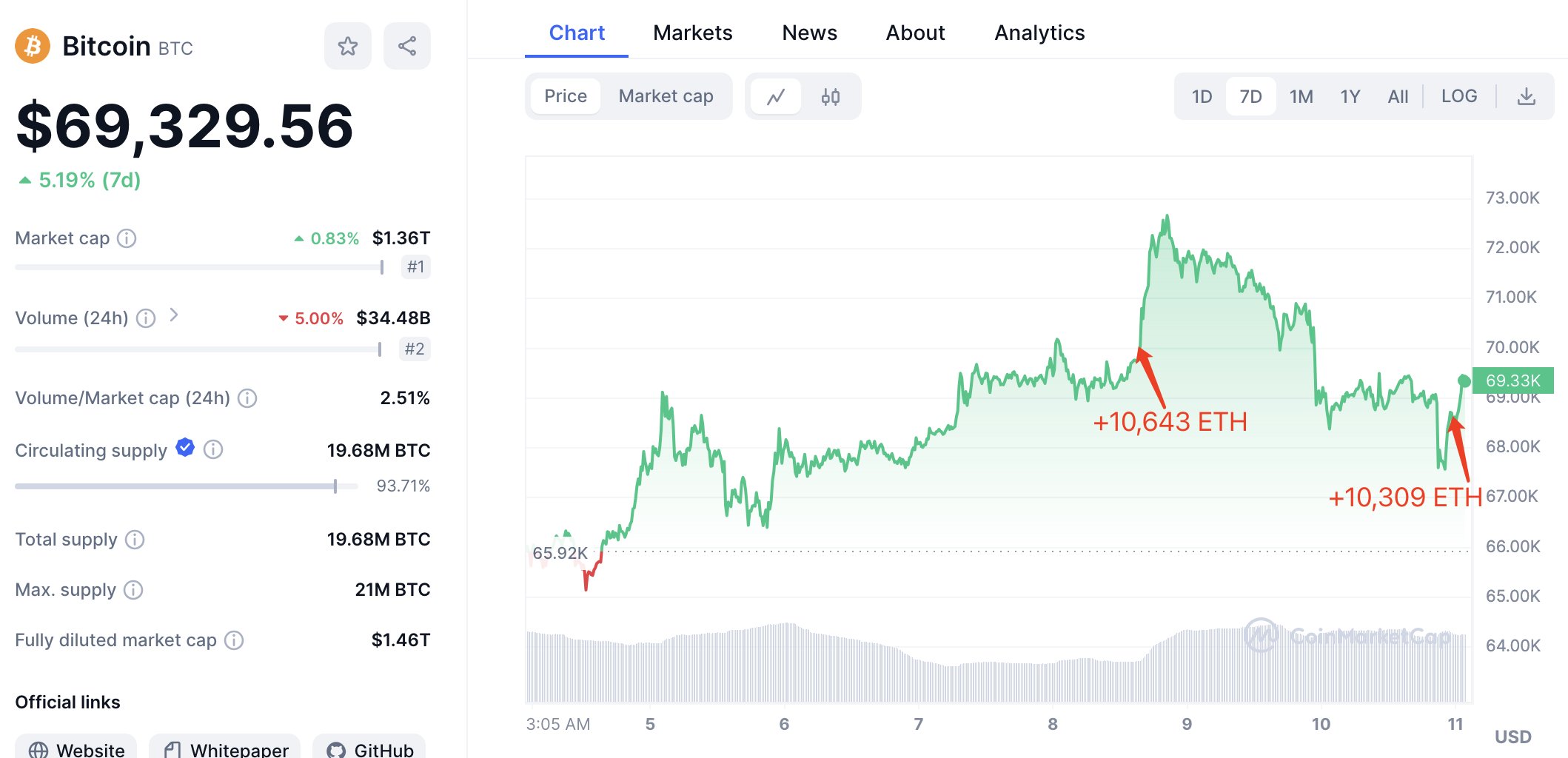 Lookonchain 监测链上数据 指出 , 在昨晚约 11 点时,一位巨鲸在市场下跌时,𧹒入 10,309 枚 ETH(约 3,582 万美元)。