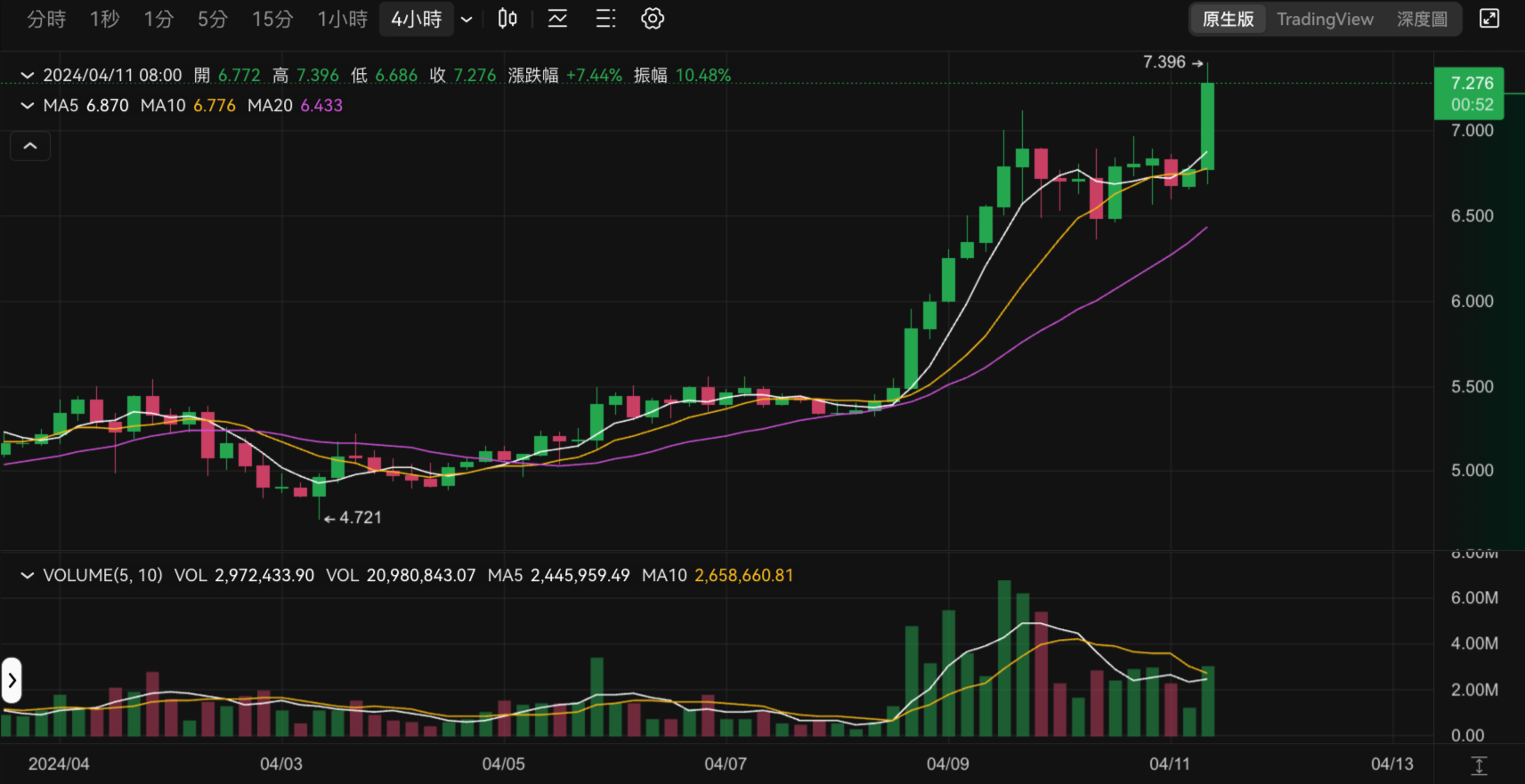 今(10)日 11:30 左右一度冲高 7.396 美元,再度刷新历史新高,近 24 小时暴涨近 13 %。撰稿当下报 7.377 美元,单月涨幅高达 113%。