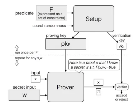 以下是 zk-snark 的运作流程图。从图中对 zk-snark 进行简单解读: