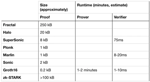 上图为目前比较主流的 zk-snark 相关技术的汇总,从中不难发现,证明的大小、证明生成时间,验证时间是衡量有关 zk-snark 技术的标准。抛开验证时间来看,大多数 zk-snark 的证明无论从证明大小和生成时间来看,都与本文起始部分,Vitalik 用以太坊为例的标准不符,值得注意的是,上述大多数技术的所在公链并不具备智能合约的功能,也无法与以太坊区块大小相提并论,所需证明尺寸和证明生成时间要求更高。