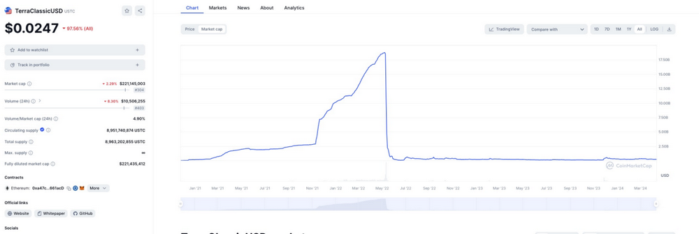 然而这并不意味着Ethena会一帆风顺,在阅读了一些官方或第三方的分析结果后,我认为我们都忽略了一个致命的因素,这就是基差。而这恰恰就是Ethena在应对挤兑现象时最脆弱的关键,或者说是死亡螺旋的关键。再次回顾一下加密货币市场中关于稳定币的两次非常典型的挤兑现象,UST崩溃和2023年3月USDC受硅谷银行破产导致的挤兑脱钩。可以发现在互联网技术发展的当下,恐慌情绪的蔓延是非常迅猛的,由此引发的挤兑的速度是非常快的,通常当恐慌出现时,在短短几小时或几天内将面临大量的赎回。这就要求稳定币机制对于挤兑的容忍能力提出了挑战,因此大部分稳定币协议的抵押品都会选择配置流动性极好的资产,并不一味追求高收益,例如短天期美债等,在发生挤兑时,协议可以通过出售抵押品换取流动性来应对。然而考虑到Ethena的抵押品类型是具备价格波动风险的加密货币与其期货合约的组合,这对两个市场的流动性提出了很大的挑战,当Ethena的发行达到一定规模后,在遭遇大规模赎回时,市场是否有足够的流动性可以通过解除该期现套利组合换取流动性,满足赎回的需求是其面临的主要风险。