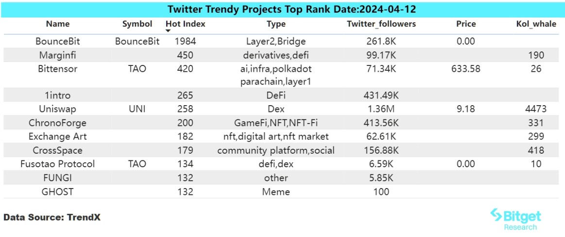 主要系 Binance 将于 2024 年 4 月 11 日 20: 00 (东八区时间)上线 Bittensor (TAO) 的公告引起推特及各社区的关注和讨论热度,先前随着人工智能(AI)在加密领域的热潮不断升温,Bittensor 网络注册子网的成本飙升至 670 万美元,AI 相关话题的社区讨论热度一直保持高位。