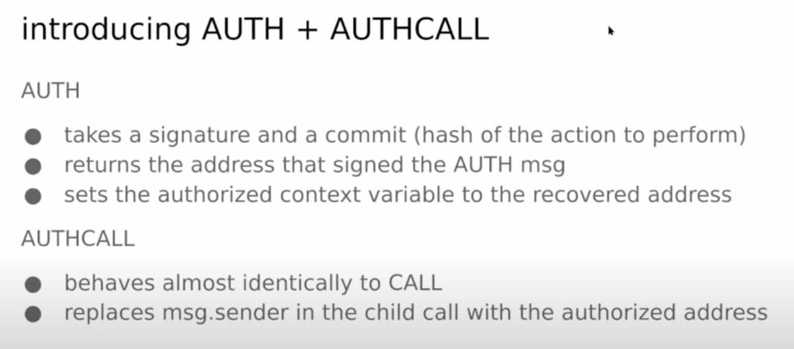 那么具体该如何将现有的 EOA 变成智能合约呢?根据 lightclients 在两年前发布的演示视频,实现这一转变的关键在于两个指令「AUTH」和「AUTHCALL」,其中,前者基于 ECDSA 签名设置 context variable「authorized」,后者作为「authorized」账户发起调用。同时,也可以围绕 「AUTHCALL」指令实现更多逻辑,为调用者和发起者提供更多控制,而不会牺牲被发起者的安全性或用户体验。