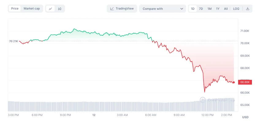 比特币在 4 月 13 日凌晨的价格走势。来源:Coinmarketcap