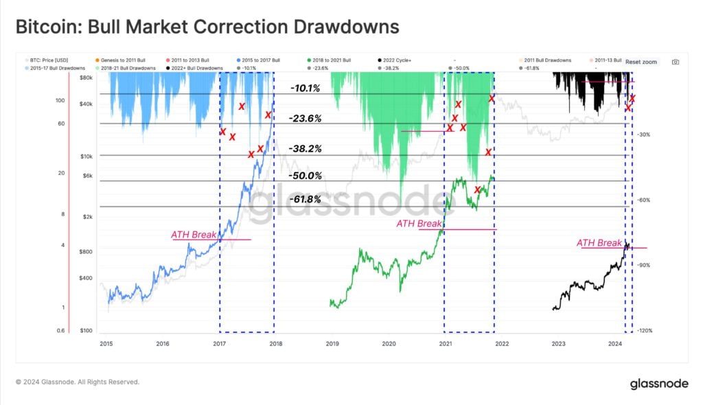 比特币今日清晨四点左右最低下杀 60,000 美元,两天内一度重挫超 15%。对此,Glassnode 分析历史数据后表示:BTC 过往突破 ATH 后曾多次出现 10%~25% 的回调,料当前还处于牛市早期。