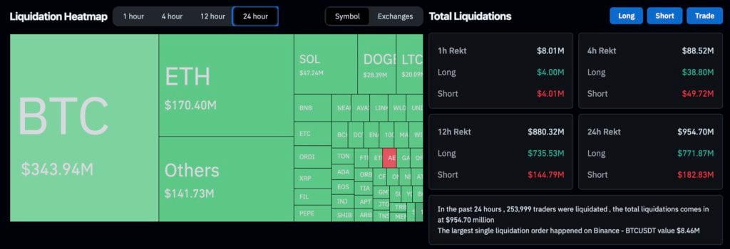 比特币一度插针 6 万美元的剧烈波动下,据 Coinglass 数据 显示:过去 24 小时,加密货币全网爆仓金额超过 9.5 亿美元、超过 25.3 万人遭清算,看多的投资者灾情惨重。