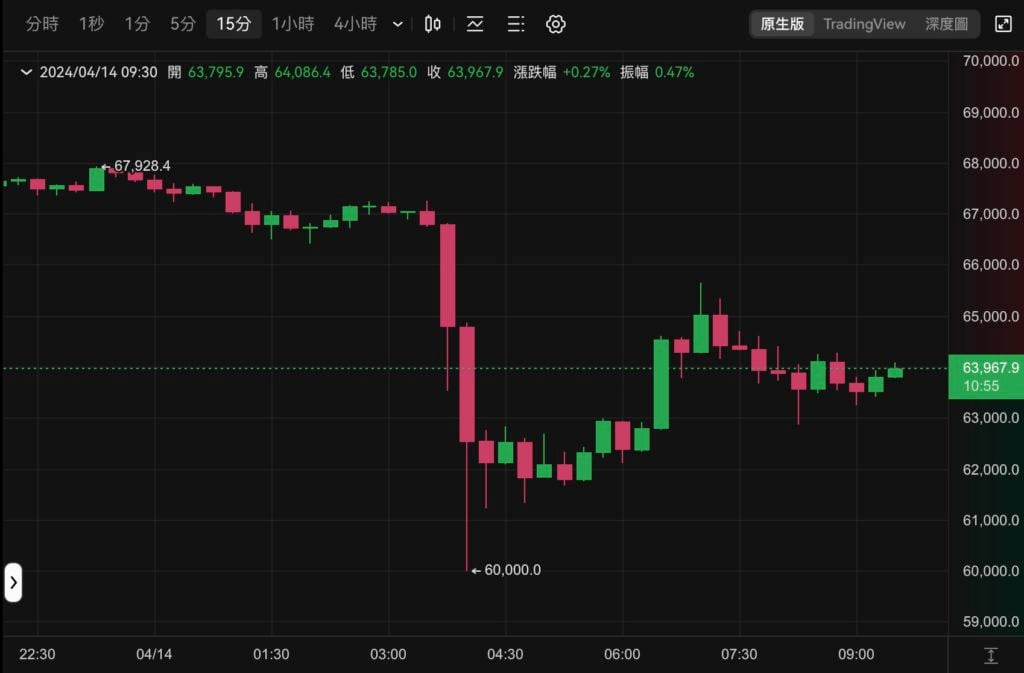 在伊朗派无人机攻击以色列消息传出之后,比特币也从 67,000 美元同步跳水,清晨四点左右最低下杀 60,000 美元,半小时内重挫超 10%。