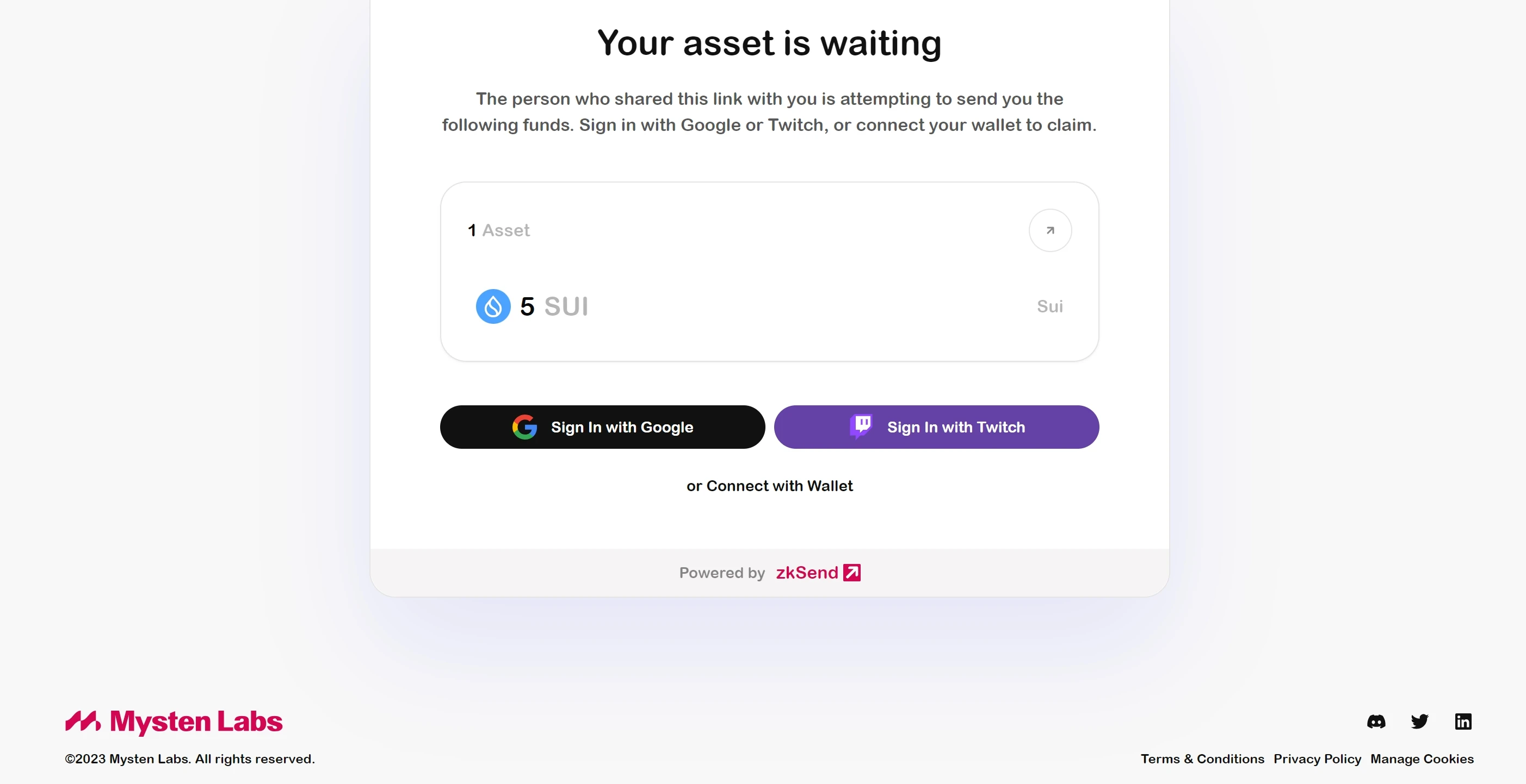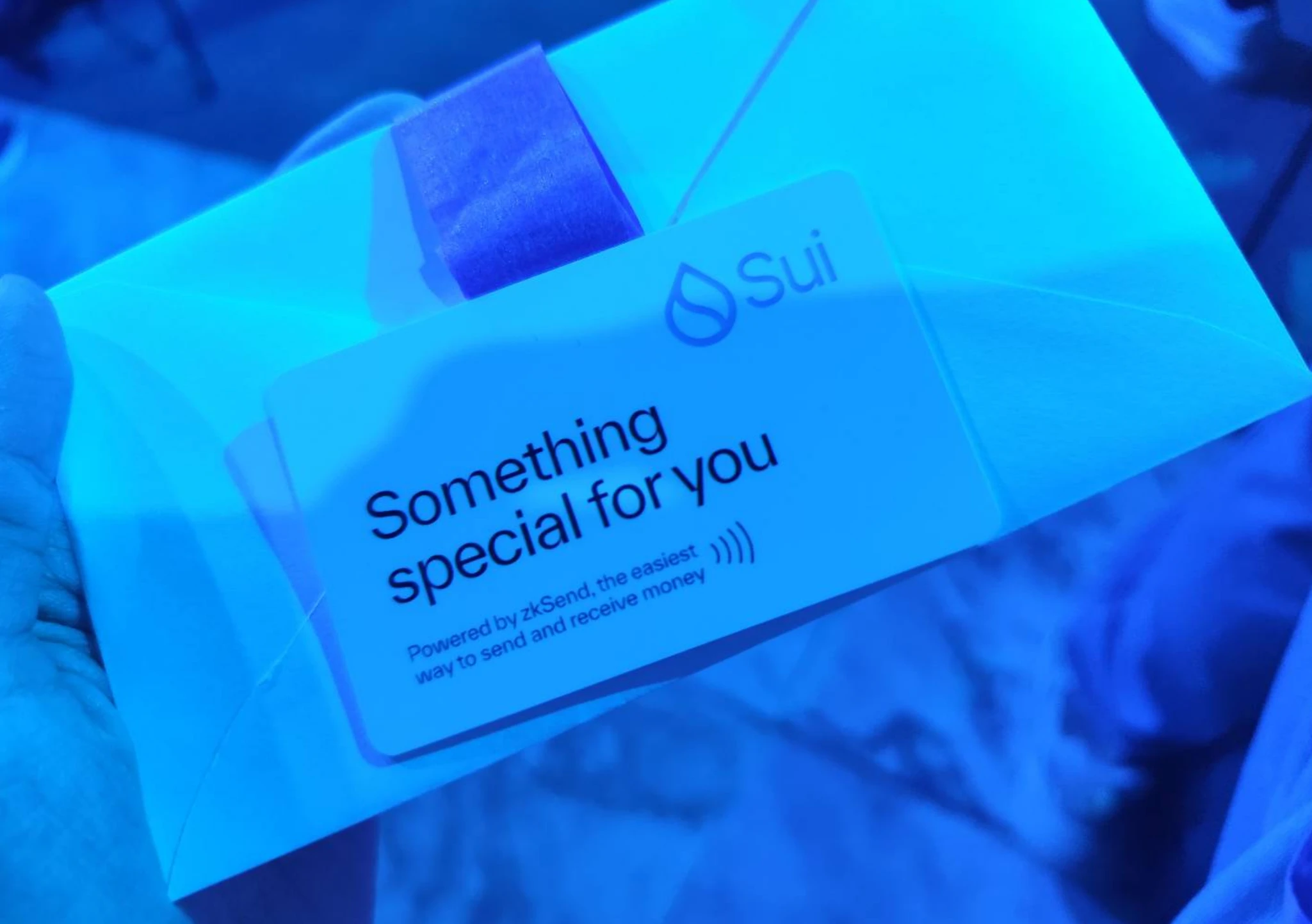 zkSend 则是另一个和现场几乎每个人发生交互的轻应用: 主办方为到场观众再准备了一份小礼物 ,在椅子下的信封中有一张卡片,打开手机 NFC 功能识别后跳转到一个 网站 ,可以申领 5 SUI。