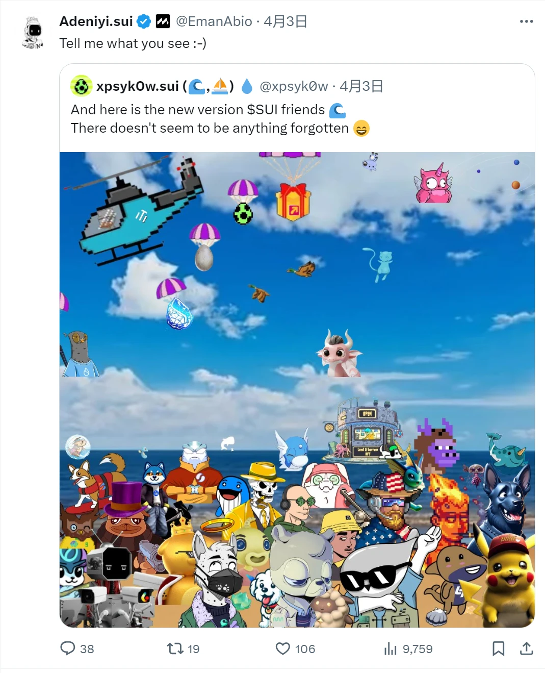 早在活动前的 4 月 3 日,Adeniyi 在 X 平台 转贴 ,图中包含着羊毛党喜闻乐见的“降落伞包”和 Sui 生态诸多代表项目。社区普遍认为,SuiLend、SuiNS、Navi 等 Sui 生态项目有着较高的空投预期,一旦协同发动,将会牵引 Sui 空投季,为 Sui 生态吸引大量资金 。